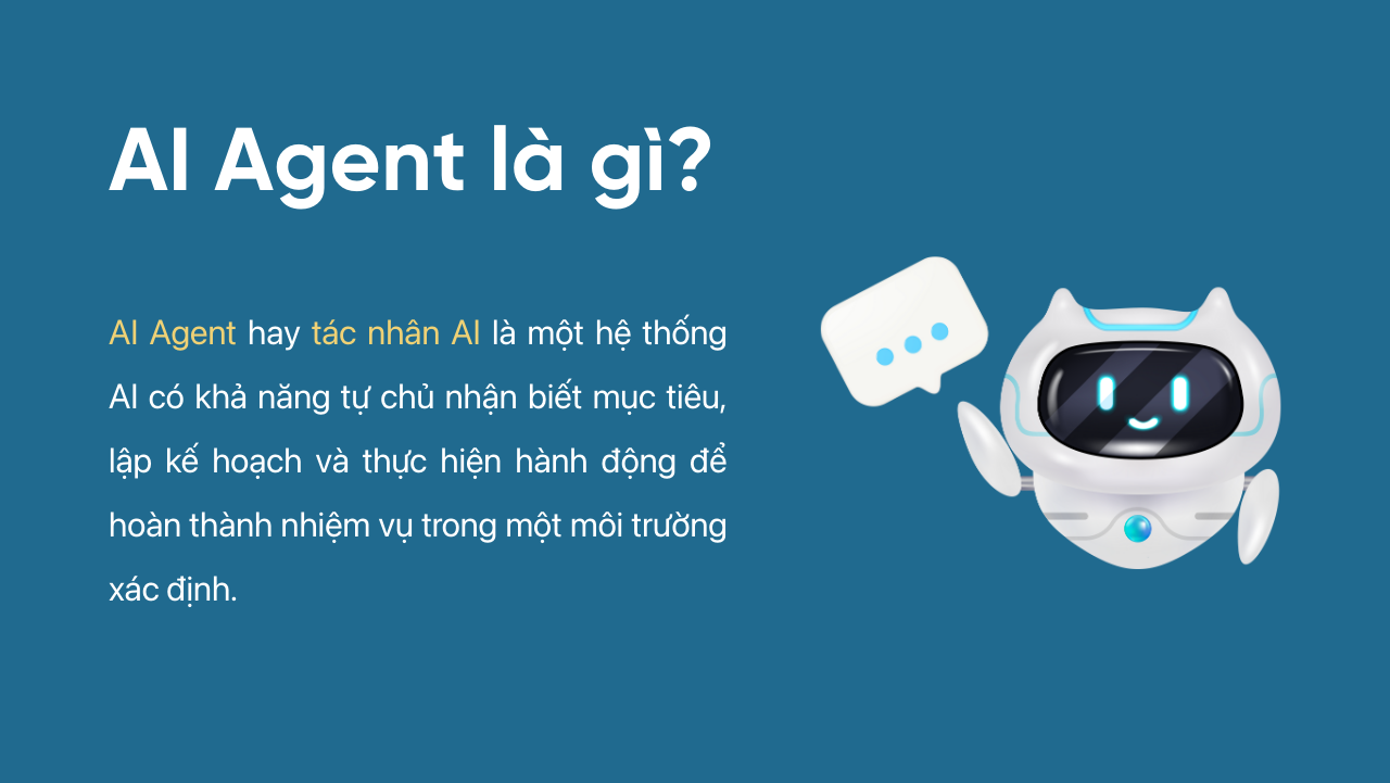 AI Agent hay tác nhân AI là một hệ thống AI có khả năng tự chủ nhận biết mục tiêu, lập kế hoạch và thực hiện hành động để hoàn thành nhiệm vụ trong một môi trường xác định. Khác với các mô hình AI truyền thống chỉ phản hồi theo từng câu lệnh riêng lẻ, AI Agent có thể vận hành liên tục theo một chuỗi hành động, biết mình cần làm gì tiếp theo và khi nào cần sử dụng công cụ hỗ trợ.