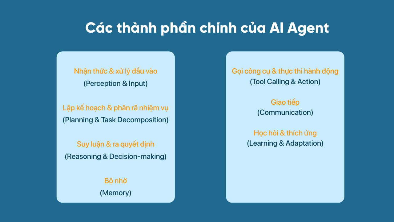 Một AI Agent không phải là một mô hình đơn lẻ, mà là sự kết hợp của nhiều thành phần chức năng phối hợp với nhau để giúp agent có thể nhận thức, suy luận, hành động và học hỏi theo thời gian. Các thành phần chính bao gồm: