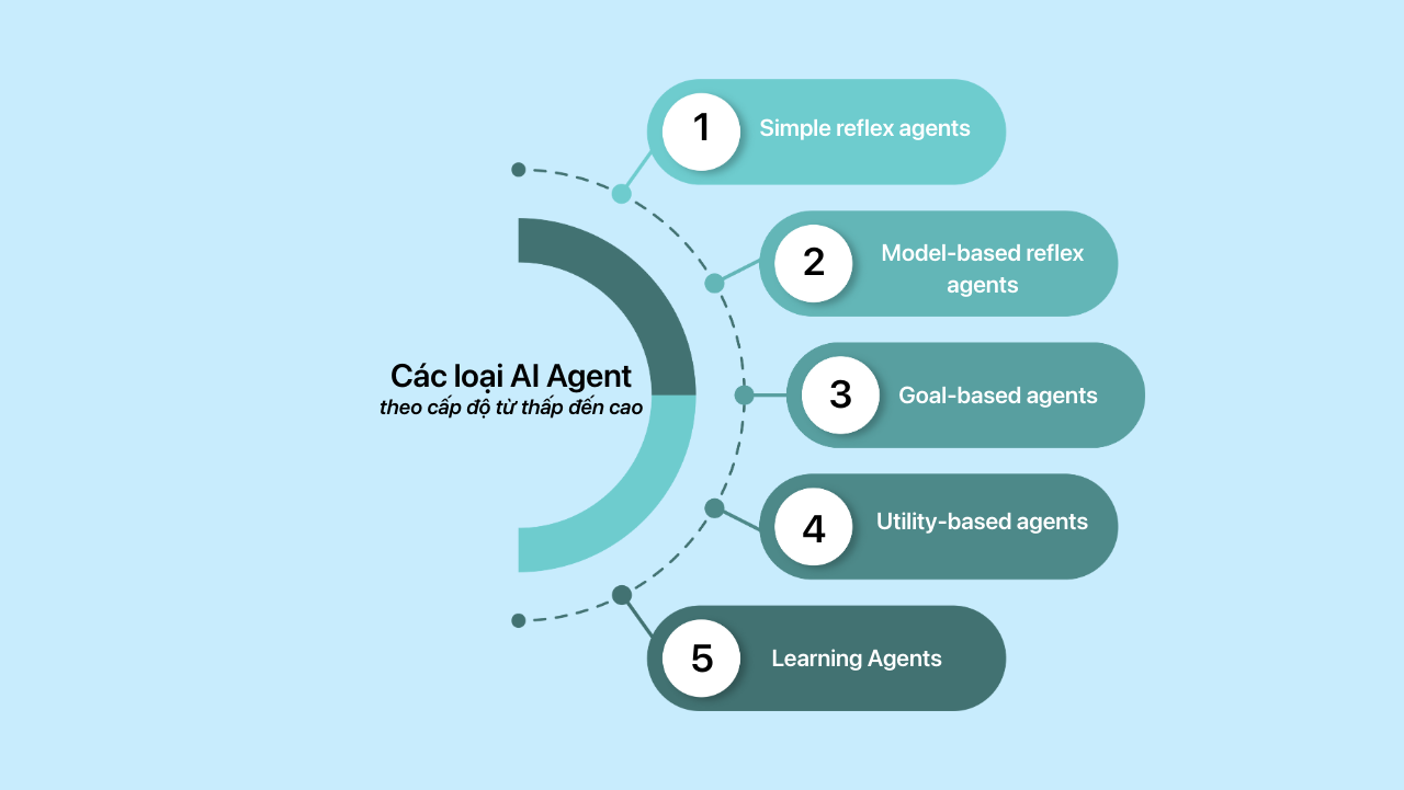 AI Agent có thể được phát triển với nhiều cấp độ năng lực khác nhau. Đối với những mục tiêu dễ thực hiện, một agent đơn giản thường được ưu tiên nhằm hạn chế sự phức tạp tính toán không cần thiết. Theo thứ tự từ đơn giản nhất đến nâng cao nhất, có 5 loại AI Agent chính: