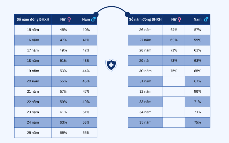 Tỷ lệ hưởng (%): phụ thuộc vào số năm đóng BHXH.