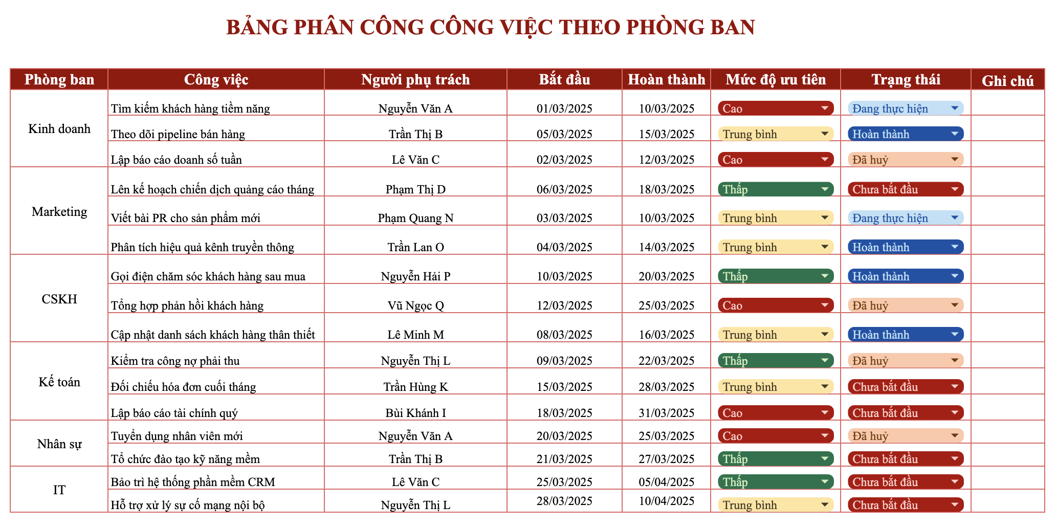 👉 TẢI NGAY: Bảng phân công công việc theo phòng ban