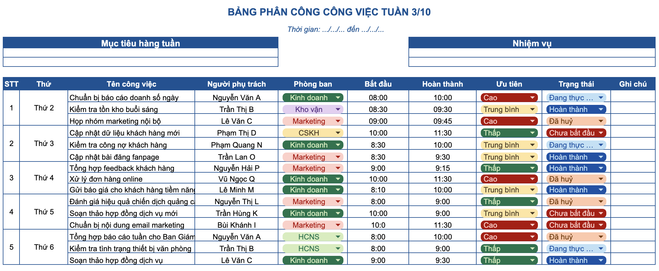 👉 TẢI NGAY: Bảng phân công công việc theo tuần
