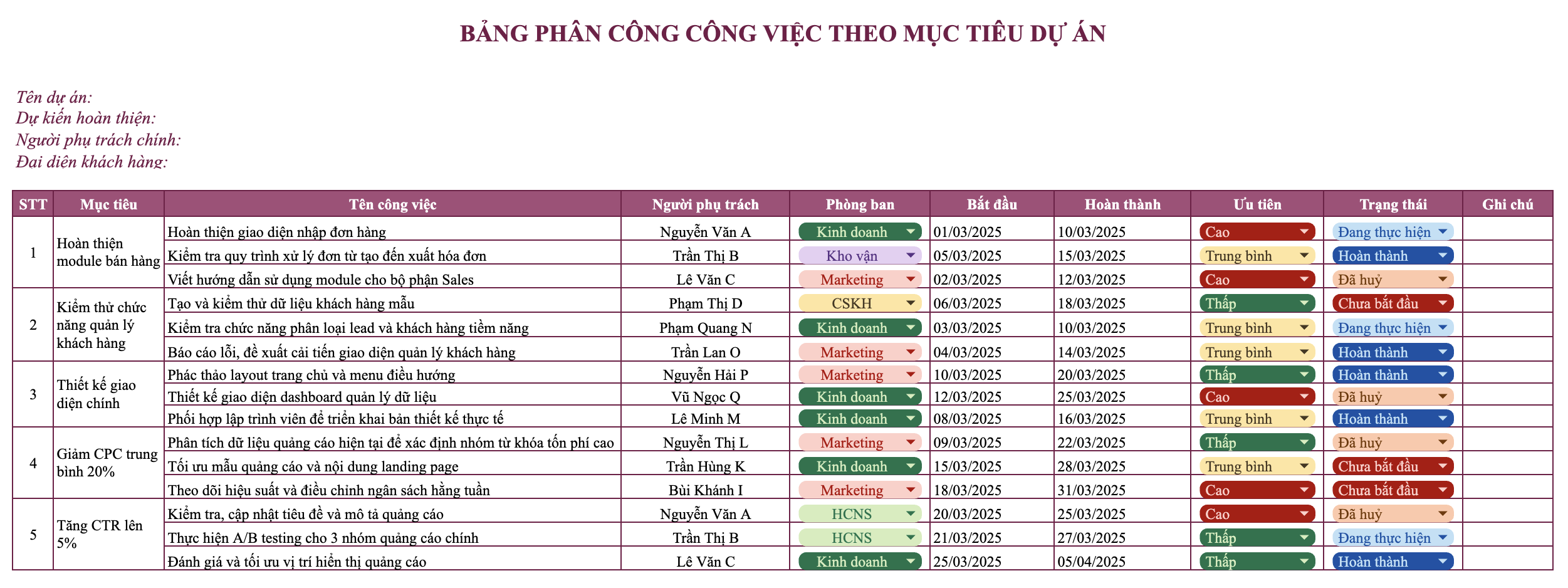 👉 TẢI NGAY: Bảng phân công công việc theo mục tiêu dự án