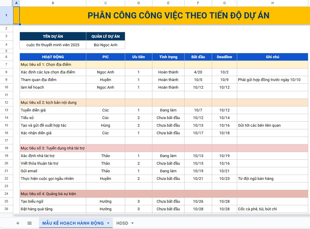 Mẫu bảng phân công công việc theo mục tiêu dự án giúp nhóm làm việc bám sát định hướng và mục tiêu cụ thể. Khi lập bảng theo dõi công việc dạng này, người quản lý có thể gán nhiệm vụ, thời gian và người phụ trách rõ ràng. Đây là cách theo dõi tiến độ công việc khoa học, giúp đảm bảo mọi thành viên cùng hướng tới kết quả chung.