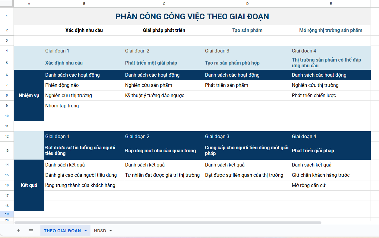 Bảng theo dõi công việc theo giai đoạn chia tiến trình dự án thành từng bước cụ thể, giúp dễ kiểm soát khối lượng và chất lượng công việc. Đây là mẫu bảng theo dõi công việc hữu ích cho các dự án dài hạn, cần giám sát chặt chẽ. Việc lập bảng theo dõi tiến độ công việc bằng Excel giúp quy trình trở nên trực quan và dễ quản lý hơn.