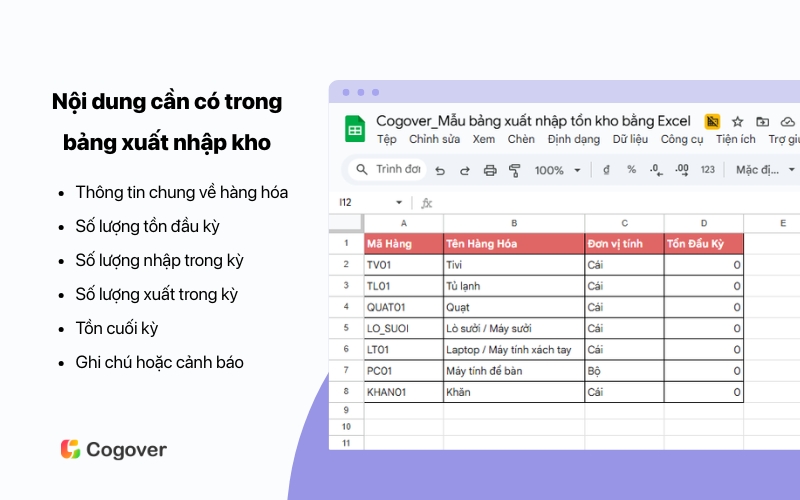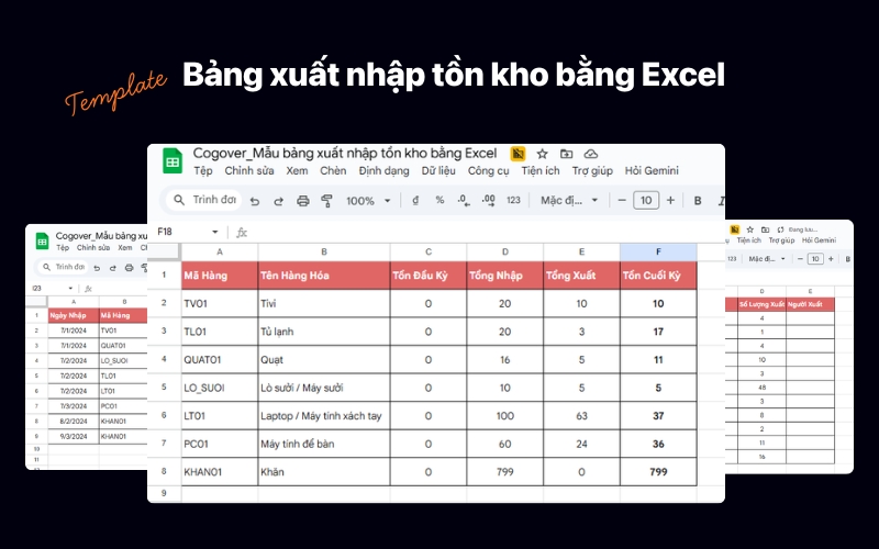 Trong bài viết này, Cogover tổng hợp 5+ mẫu bảng xuất nhập tồn kho bằng Excel miễn phí, kèm hướng dẫn tạo file từ A-Z với các công thức tự động (SUMIF, VLOOKUP, IF...), các lỗi thường gặp cần tránh, và gợi ý thời điểm nên nâng cấp lên phần mềm quản lý kho chuyên nghiệp.