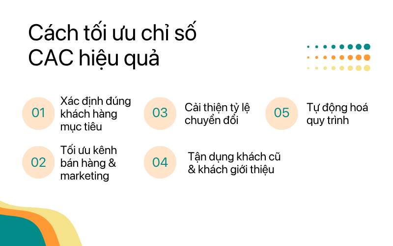 Giảm CAC không chỉ là cắt giảm chi phí, mà là tối ưu toàn bộ hành trình thu hút khách hàng. Doanh nghiệp cần kết hợp nhiều giải pháp đồng thời để vừa giảm chi phí, vừa tăng hiệu quả. Dưới đây là một số cách tối ưu CAC phổ biến:
