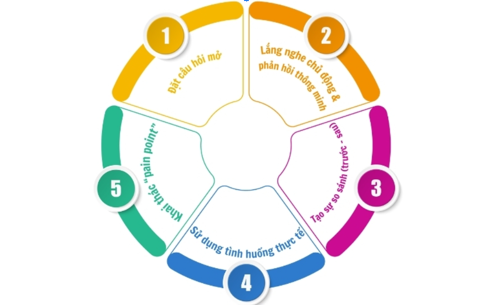 Để khơi gợi nhu cầu, nhân viên sales không thể chỉ dừng lại ở việc giới thiệu sản phẩm. Thay vào đó, cần áp dụng những kỹ thuật giao tiếp tinh tế, giúp khách hàng tự nhận ra vấn đề và mong muốn thay đổi. Dưới đây là 5 cách phổ biến và hiệu quả mà bạn có thể áp dụng ngay trong quá trình làm việc với khách hàng.