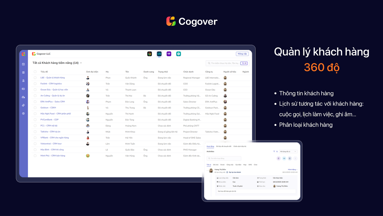 Ở giai đoạn này, nhiều doanh nghiệp bắt đầu gặp khó khăn khi số lượng tương tác tăng lên nhưng không có công cụ quản lý tập trung. Các nền tảng CRM như Cogover CRM giúp doanh nghiệp lưu trữ toàn bộ lead đến từ mạng xã hội, theo dõi lịch sử trao đổi, phân công sales xử lý và kiểm soát trạng thái từng khách hàng trên một hệ thống duy nhất. Điều này giúp quá trình tìm kiếm khách hàng qua mạng xã hội không chỉ dừng ở việc tạo tương tác, mà chuyển hóa thành cơ hội bán hàng thực tế.