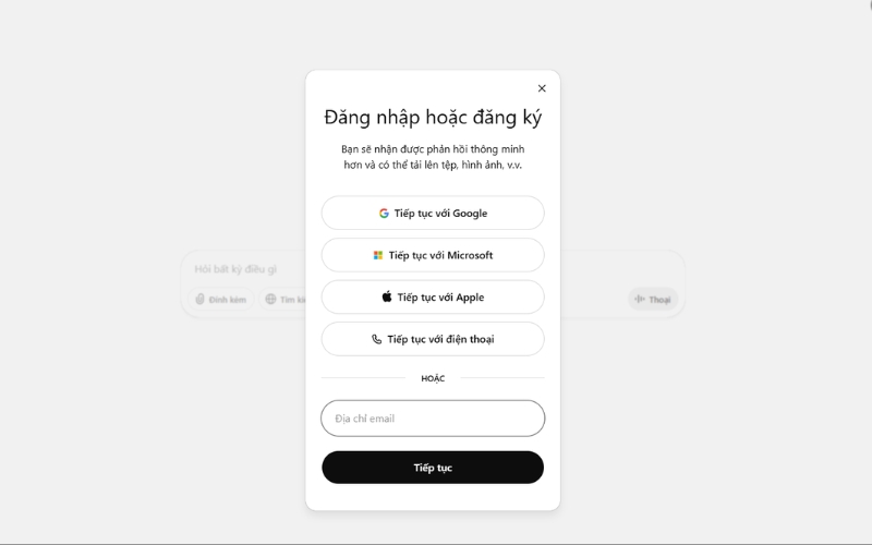 Nhập email hoặc đăng ký nhanh bằng tài khoản Google/Microsoft.