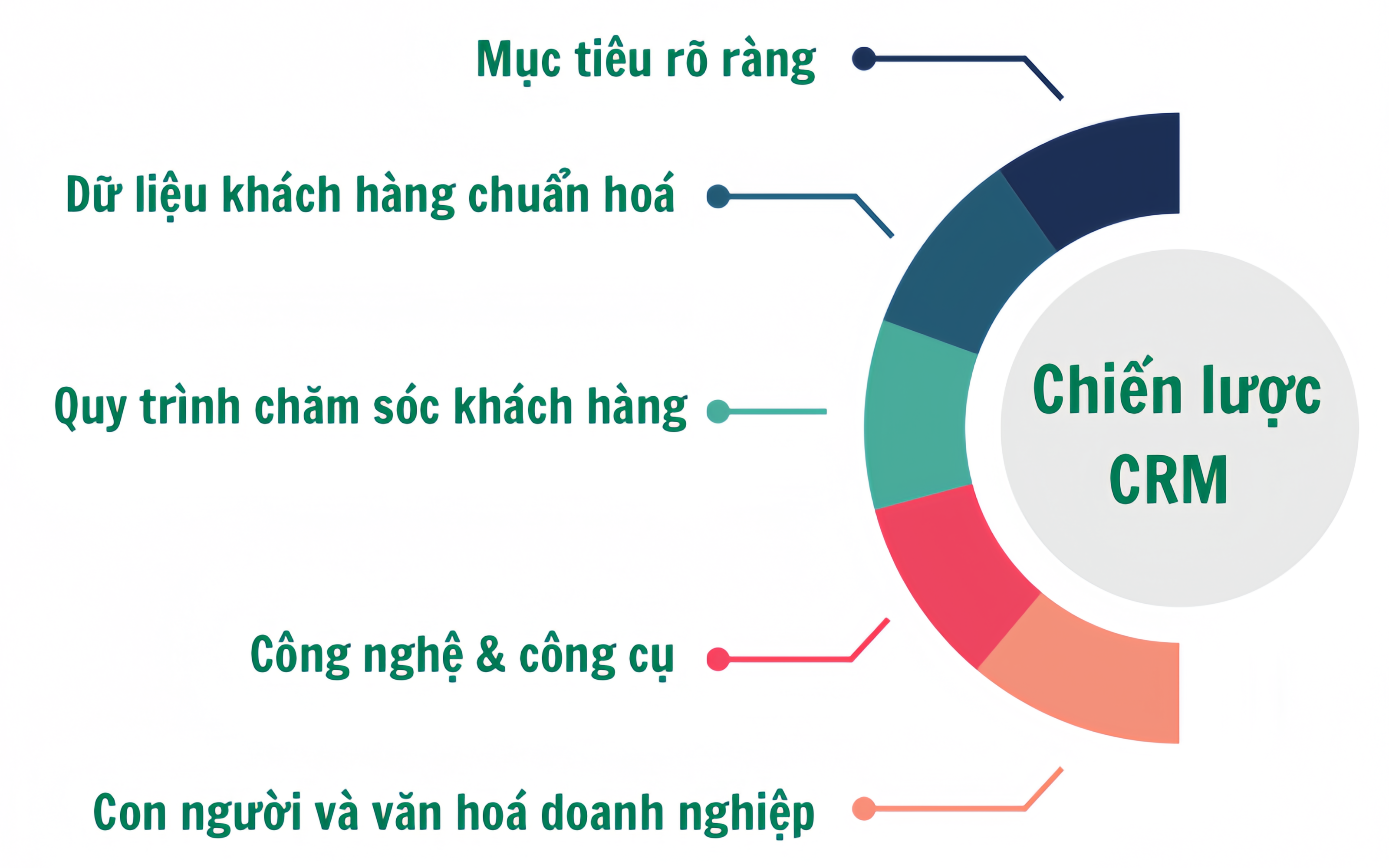 Một chiến lược CRM không chỉ dừng lại ở công nghệ, mà cần sự kết hợp đồng bộ giữa mục tiêu kinh doanh, dữ liệu, con người và quy trình. Các thành phần cốt lõi bao gồm: