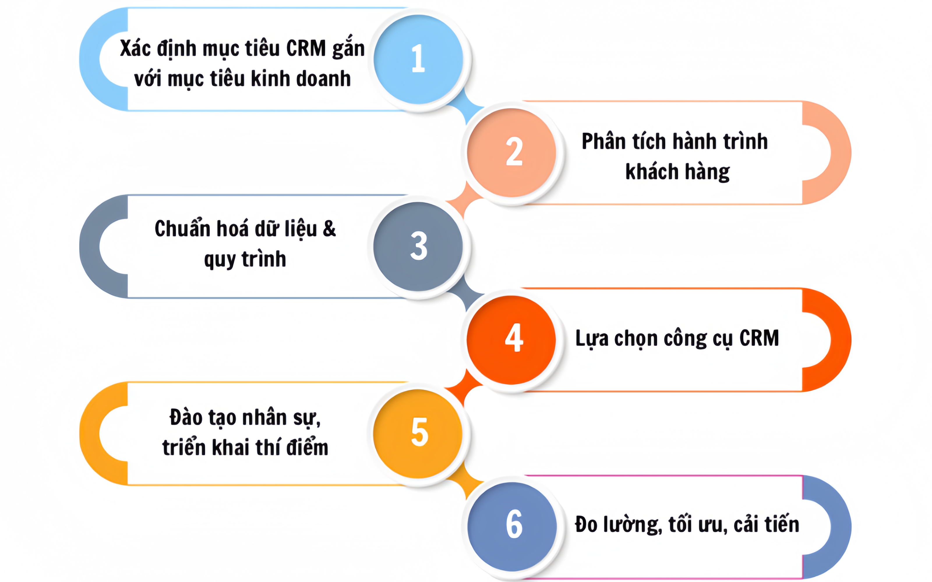Để chiến lược CRM không chỉ nằm trên giấy tờ mà thực sự được triển khai hiệu quả, doanh nghiệp cần chuẩn bị một lộ trình bài bản. Dưới đây là 6 bước quan trọng: