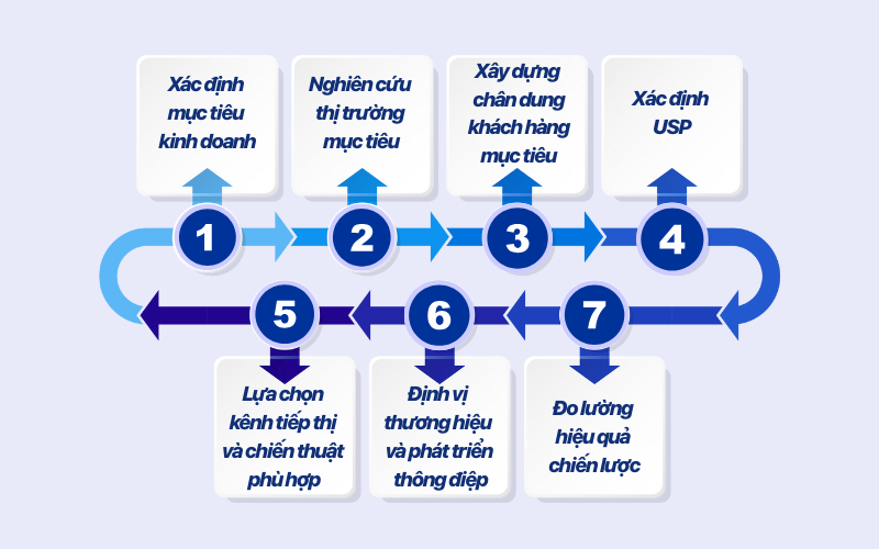 Để chiến lược marketing mang lại hiệu quả rõ ràng, doanh nghiệp cần một quy trình triển khai bài bản, không bỏ sót những yếu tố quan trọng. Dưới đây là 7 bước nền tảng giúp doanh nghiệp xây dựng một chiến lược marketing hoàn chỉnh, có thể áp dụng cho mọi ngành từ F&B, thời trang, dịch vụ đến B2B.