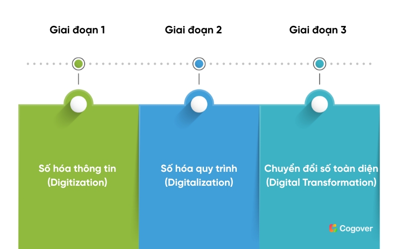 Hành trình chuyển đổi số được chia thành 3 giai đoạn chính: Số hóa thông tin (Digitization) – Số hóa quy trình (Digitalization) – Chuyển đổi số toàn diện (Digital Transformation).