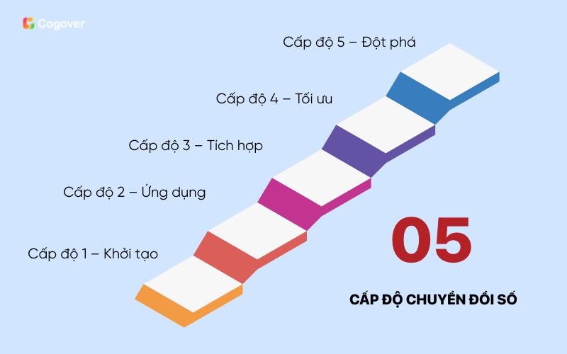 Chuyển đổi số không diễn ra trong một sớm một chiều mà là một hành trình trưởng thành theo từng cấp độ. Mỗi cấp độ phản ánh mức độ ứng dụng công nghệ, mức độ tối ưu quy trình, khả năng khai thác dữ liệu và mức độ thay đổi văn hóa – mô hình vận hành của tổ chức. Dưới đây là 5 cấp độ chuyển đổi số phổ biến, được nhiều quốc gia và tổ chức tư vấn quốc tế sử dụng.