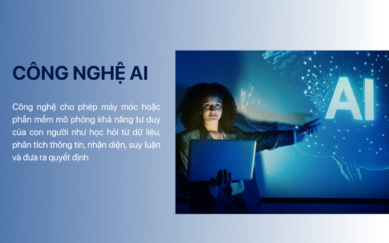 Công nghệ AI (Artificial Intelligence – trí tuệ nhân tạo) là công nghệ cho phép máy móc hoặc phần mềm mô phỏng khả năng tư duy của con người như học hỏi từ dữ liệu, phân tích thông tin, nhận diện, suy luận và đưa ra quyết định. Thay vì chỉ làm theo các quy tắc được lập trình sẵn, AI có thể tự cải thiện kết quả theo thời gian dựa trên dữ liệu mới.