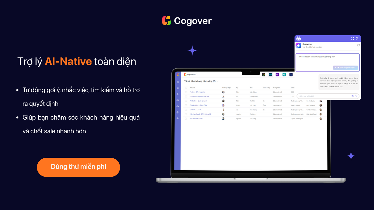 Cogover CRM là nền tảng CRM No-code & AI-native giúp doanh nghiệp đưa AI vào quản trị quan hệ khách hàng ngay trong lõi vận hành, không cần thay đổi hệ thống cũ hay phụ thuộc đội ngũ IT. Thay vì chỉ lưu trữ dữ liệu, CRM ứng dụng AI cho phép hiểu sâu khách hàng – tự động hóa hành động – dự báo kết quả kinh doanh.