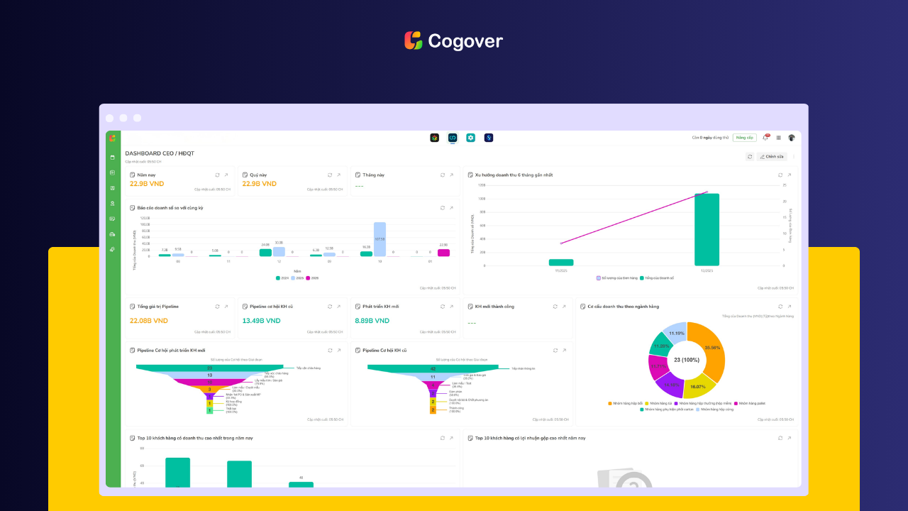 Nếu doanh nghiệp đang sử dụng hệ thống CRM để quản lý bán hàng và chăm sóc khách hàng, việc tạo Dashboard trực tiếp trong CRM sẽ tiện lợi và hiệu quả hơn rất nhiều so với việc xuất dữ liệu ra Excel rồi xây dựng Dashboard riêng. Cogover CRM là nền tảng quản lý bán hàng và chăm sóc khách hàng thế hệ mới, sở hữu hệ thống báo cáo và Dashboard mạnh mẽ, trực quan và dễ tùy biến. Đây là công cụ đắc lực giúp doanh nghiệp theo dõi toàn diện mọi hoạt động kinh doanh - từ doanh thu, hiệu suất đội ngũ, cho đến hành trình khách hàng ngay tại một nơi duy nhất.
