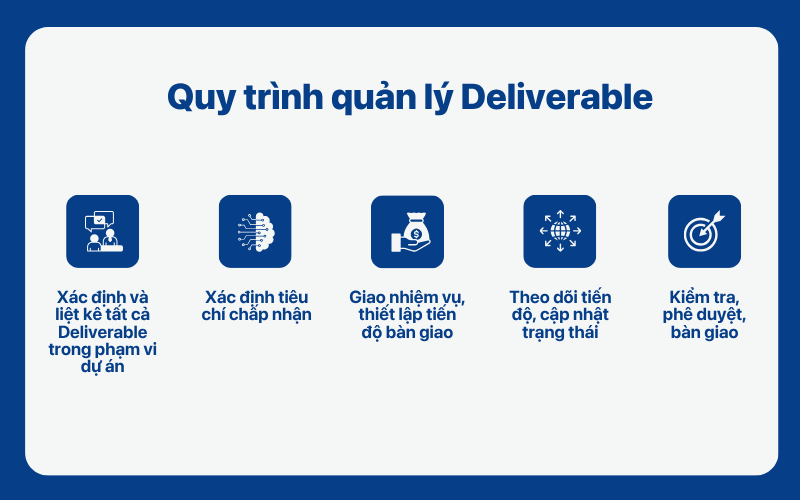 Một dự án chỉ vận hành hiệu quả khi các deliverable được xác định rõ, theo dõi sát sao và bàn giao đúng tiến độ. Dưới đây là 5 bước quản lý deliverable phổ biến trong quản lý dự án chuyên nghiệp: