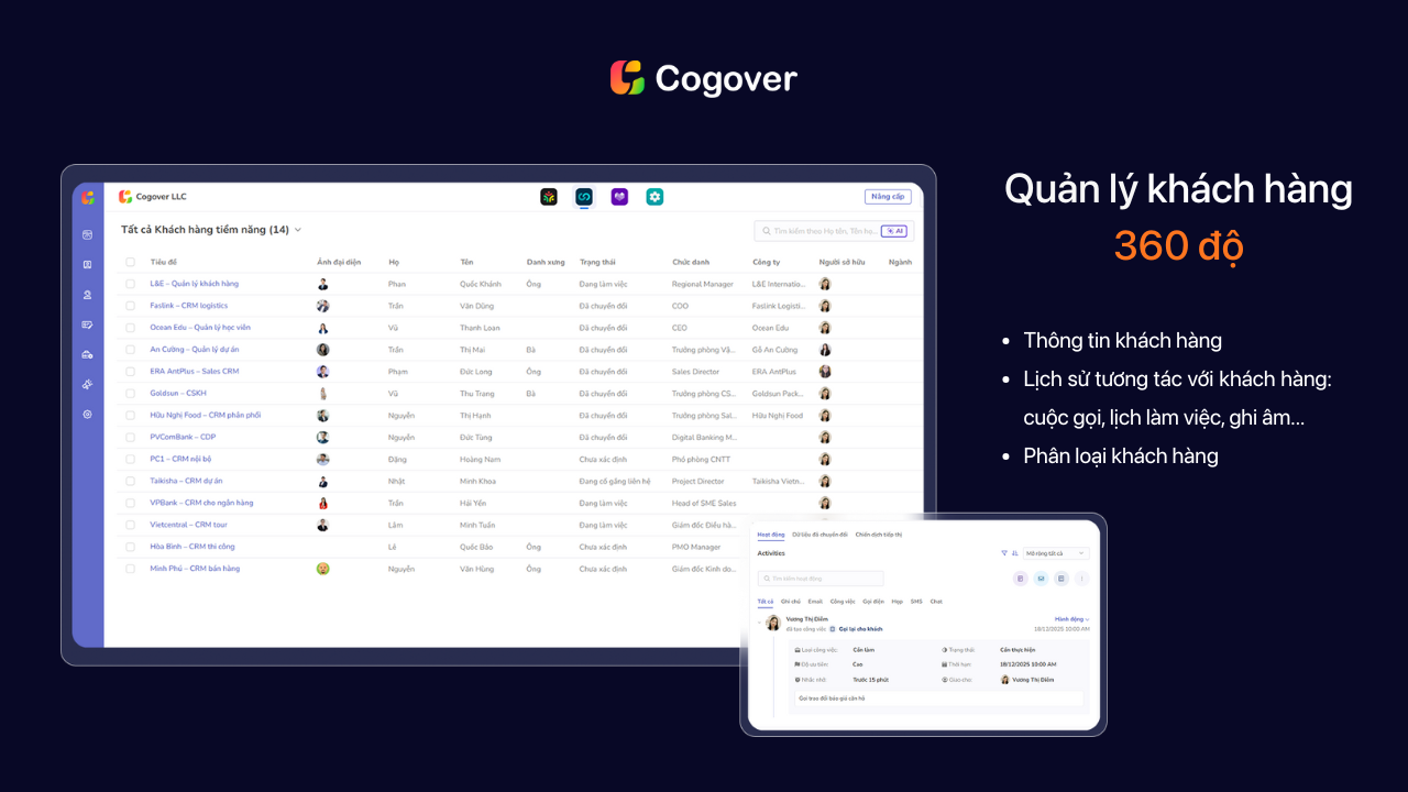 Nhờ các tính năng này, Cogover CRM không chỉ giúp số hóa quy trình kinh doanh mà còn hỗ trợ doanh nghiệp vận hành thông minh, nâng cao trải nghiệm khách hàng và thúc đẩy tăng trưởng bền vững trong môi trường số.
