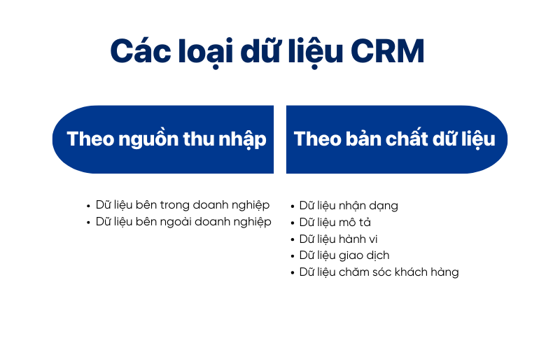 Dữ liệu CRM trong doanh nghiệp xuất hiện dưới nhiều dạng khác nhau, tùy theo nguồn thu thập và bản chất thông tin. Việc phân loại rõ ràng giúp doanh nghiệp quản lý dữ liệu khoa học hơn, tránh trùng lặp và dễ dàng khai thác trong bán hàng - marketing - chăm sóc khách hàng.