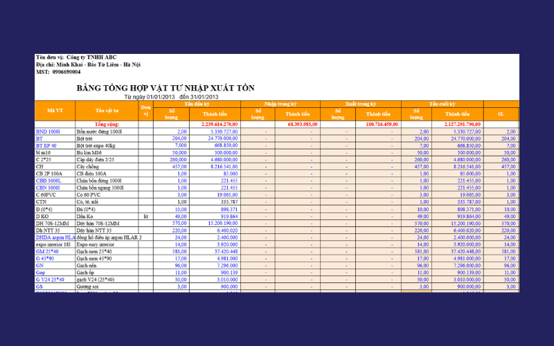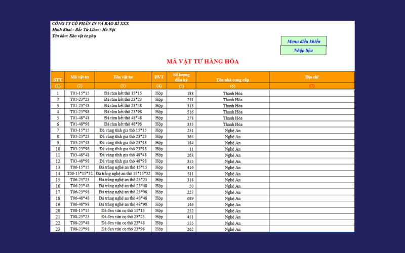 Đây là file dành riêng cho doanh nghiệp xây dựng, sản xuất hoặc cơ khí - nơi có hàng trăm mã vật tư khác nhau.