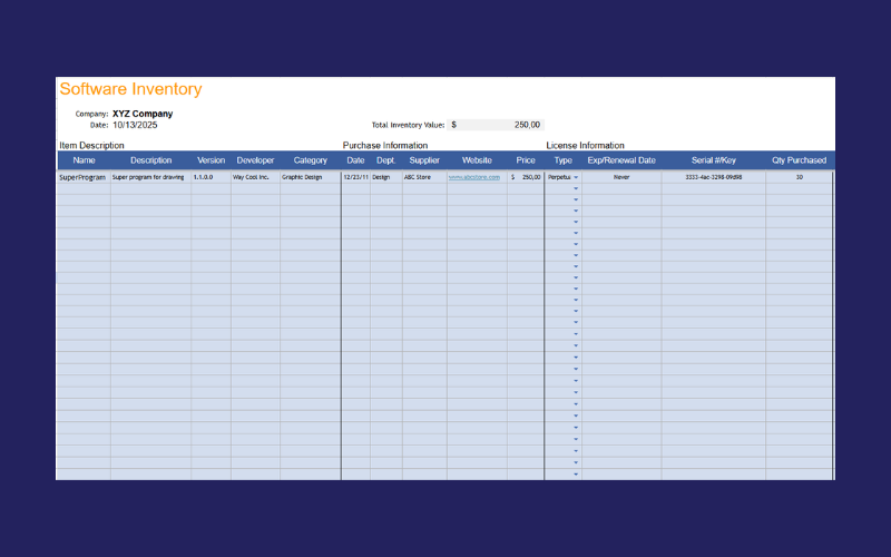 Phù hợp với doanh nghiệp IT, đơn vị cung ứng thiết bị, hoặc bộ phận IT nội bộ, mẫu file này được thiết kế để theo dõi song song cả tài sản vật lý và giấy phép phần mềm.