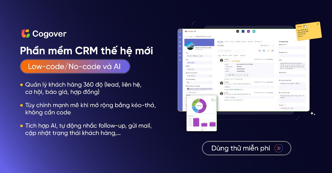 Nhiều doanh nghiệp tại Việt Nam hiện đã triển khai Cogover CRM No-code & AI – để hiện đại hóa công tác quản lý khách hàng. Với Cogover CRM, doanh nghiệp có thể thiết lập toàn bộ luồng công việc: từ khi khách hàng được thêm mới → chăm sóc tự động qua email/tin nhắn → ghi nhận phản hồi → tạo ticket CSKH → phân công nhân viên xử lý → đến khi hoàn tất.
