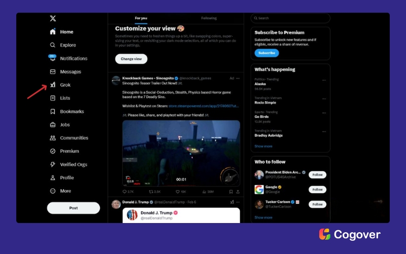 Bước 2: Chọn mục Grok AI trong menu hoặc gõ “Grok” trên thanh tìm kiếm.