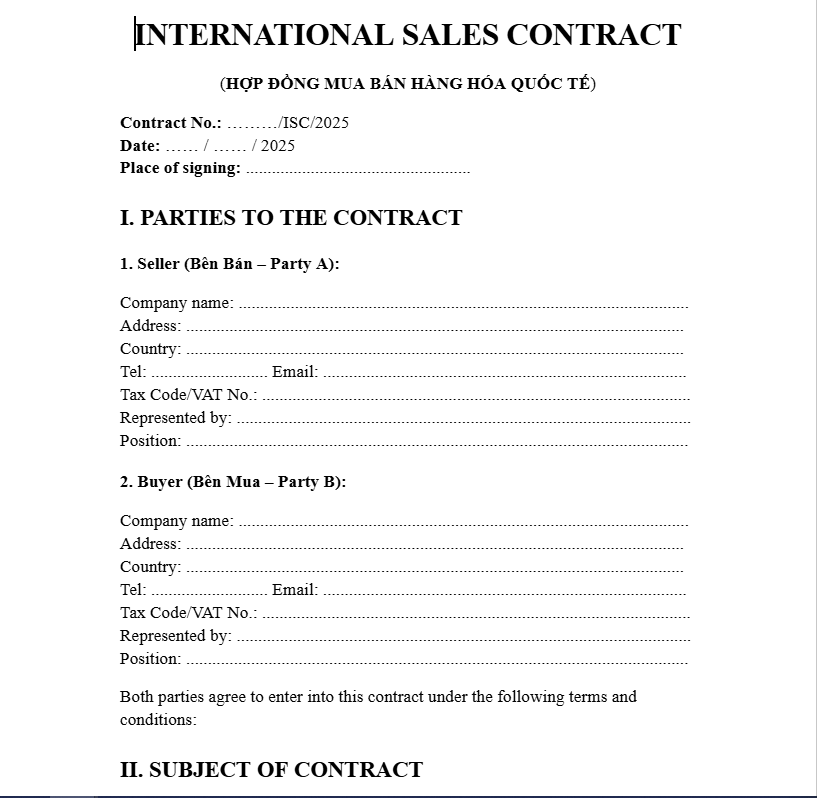 Sử dụng trong giao dịch có yếu tố nước ngoài, chịu sự điều chỉnh bởi Luật Thương mại Việt Nam 2005 và Công ước Vienna về hợp đồng mua bán hàng hóa quốc tế (CISG). So với hợp đồng trong nước, mẫu này có thêm nhiều điều khoản đặc thù: điều kiện giao hàng theo Incoterms (FOB, CIF, EXW...), đơn vị tiền tệ quy đổi, phương thức thanh toán quốc tế (L/C, T/T, D/P), quy định về vận chuyển và bảo hiểm hàng hóa, cơ chế giải quyết tranh chấp quốc tế.