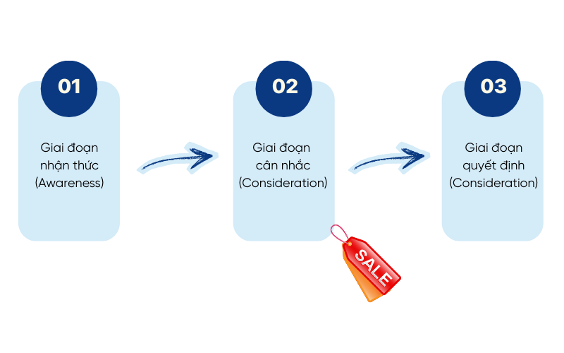 Để chiến lược Inbound Sales mang lại hiệu quả, doanh nghiệp cần bắt đầu từ việc hiểu rõ hành trình mua hàng của khách hàng, thay vì chỉ tập trung vào mục tiêu doanh thu hoặc sản phẩm. Khi nắm được khách hàng đang ở giai đoạn nào, doanh nghiệp mới có thể tiếp cận đúng thời điểm và đưa ra nội dung, thông điệp phù hợp. Thông thường, hành trình mua hàng của khách hàng sẽ gồm 3 giai đoạn chính: Nhận thức - Cân nhắc - Quyết định.
