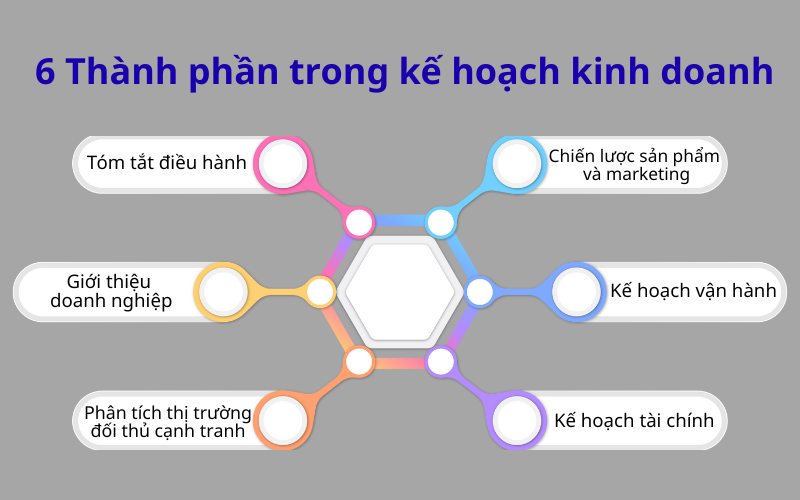 Một kế hoạch kinh doanh hoàn chỉnh cần được xây dựng dựa trên các thành phần cốt lõi, phản ánh đầy đủ bức tranh tổng thể về doanh nghiệp và định hướng phát triển trong tương lai. Việc trình bày đầy đủ các nội dung này không chỉ giúp doanh nghiệp dễ dàng triển khai kế hoạch trong thực tế mà còn tạo cơ sở để thuyết phục nhà đầu tư, đối tác và các bên liên quan. Dưới đây là sáu thành phần bắt buộc cần có trong một kế hoạch kinh doanh.