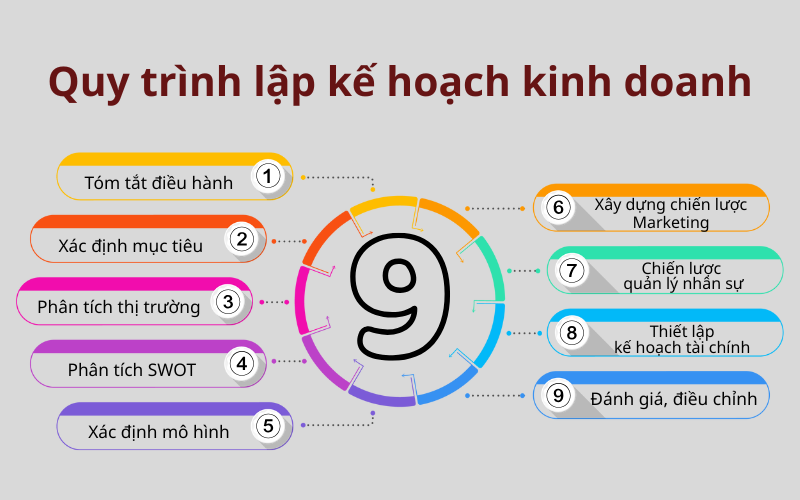 Để xây dựng một kế hoạch kinh doanh khả thi và có thể triển khai hiệu quả, doanh nghiệp cần tuân theo một quy trình rõ ràng với các bước cụ thể. Việc thực hiện đầy đủ từng bước không chỉ giúp bản kế hoạch có tính logic mà còn hỗ trợ doanh nghiệp kiểm soát rủi ro, tối ưu nguồn lực và thích ứng linh hoạt với sự thay đổi của thị trường. Dưới đây là chín bước quan trọng trong quá trình lập kế hoạch kinh doanh.