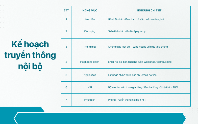Kênh truyền thông nội bộ: Email, bản tin nội bộ, app HRM, workshop, sự kiện.