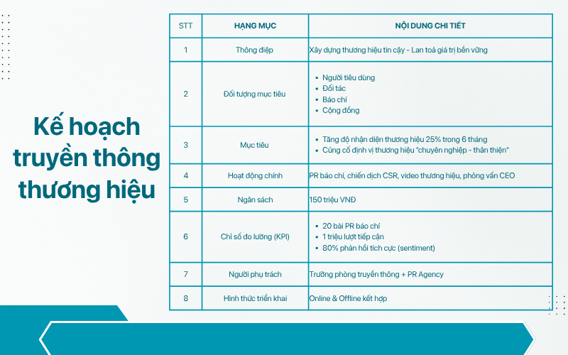 Mục tiêu Marketing & truyền thông: Xác định rõ các mục tiêu cần đạt được. Ví dụ “tăng 15% nhận diện thương hiệu trong 6 tháng” hoặc “đạt 1.000 đơn hàng online”.