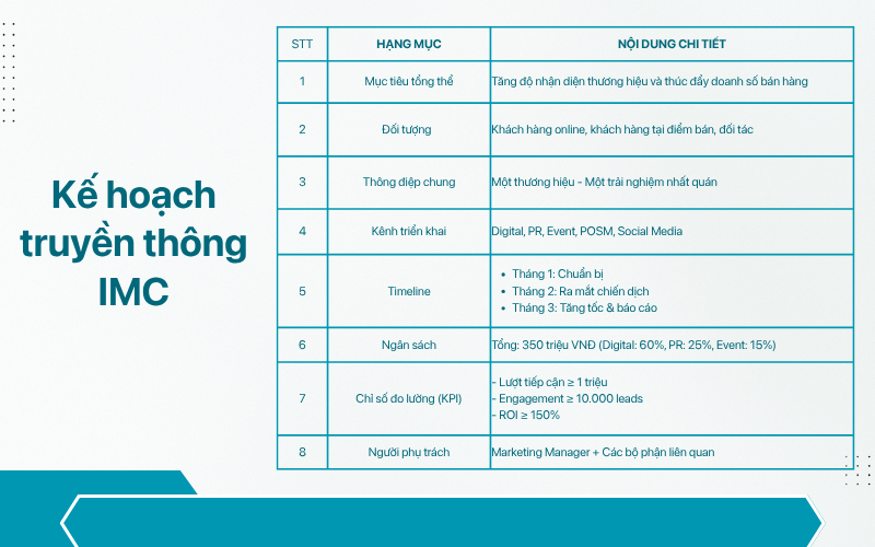 Kế hoạch truyền thông tích hợp là cách kết hợp truyền thông online và offline để thông điệp được truyền đi thống nhất ở mọi nơi. Nhờ vậy, doanh nghiệp tiếp cận khách hàng hiệu quả hơn và tạo được ấn tượng mạnh mẽ, bền vững.Đối tượng áp dụng: Doanh nghiệp triển khai chiến dịch quy mô lớn (ra mắt sản phẩm, mở rộng thị trường, kỷ niệm thương hiệu).