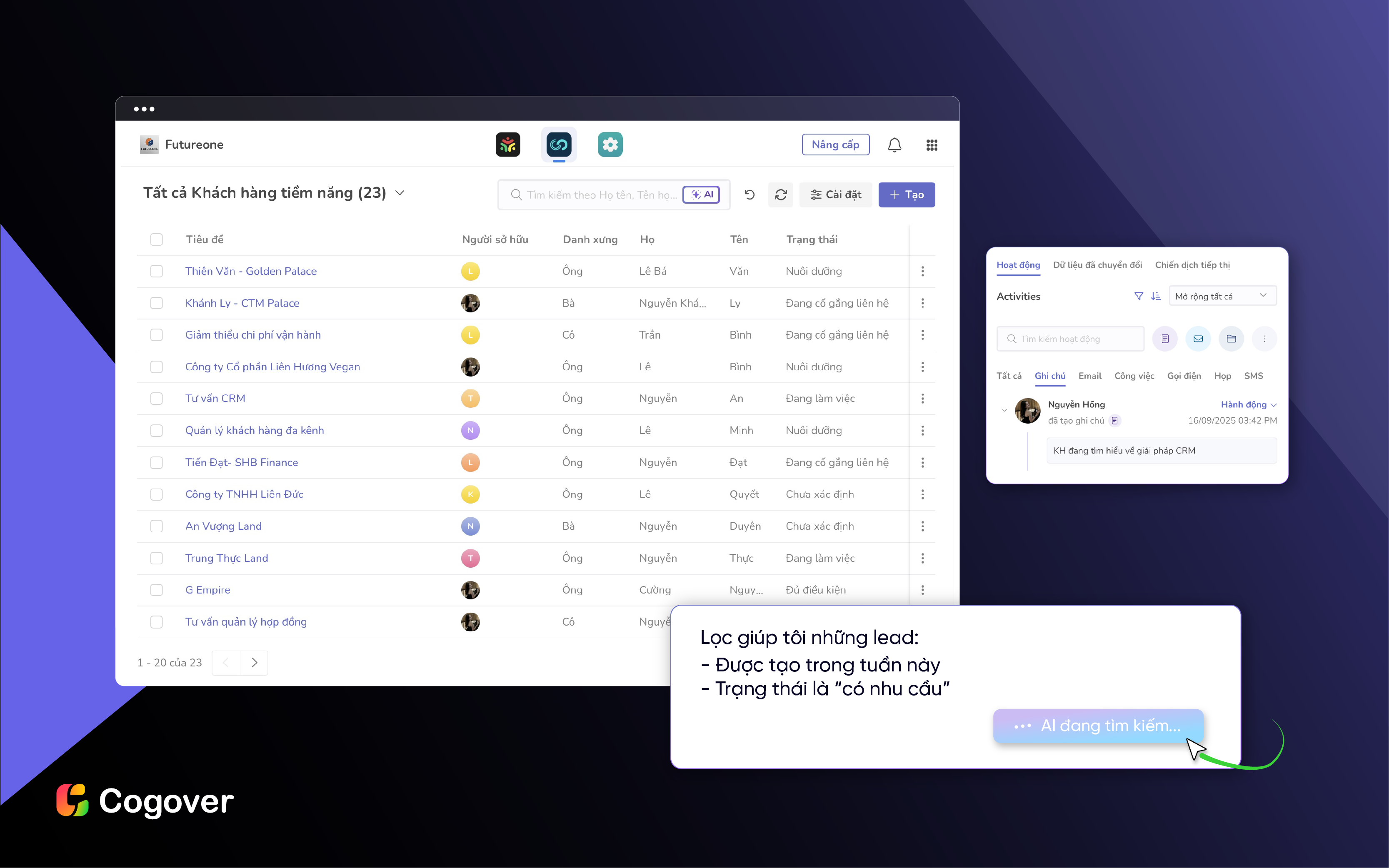 Trong bối cảnh các xu hướng trên đều gắn liền với dữ liệu, cá nhân hóa và tự động hóa, doanh nghiệp rất cần một nền tảng hỗ trợ quản lý toàn diện. Đây chính là điểm mạnh của Cogover CRM No-code/AI với khả năng: