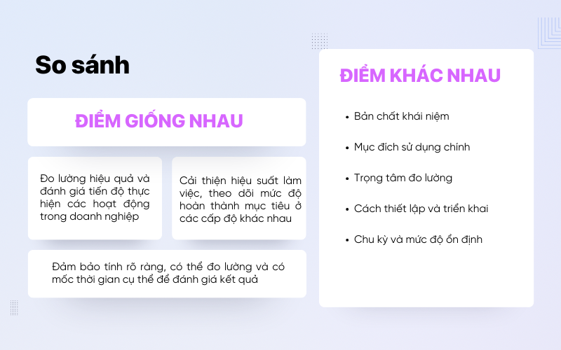 Để sử dụng KPI và OKR hiệu quả, doanh nghiệp cần hiểu rõ cả những điểm tương đồng và khác biệt giữa hai công cụ này. Mặc dù cùng được sử dụng trong quản trị và đo lường hiệu quả, KPI và OKR phục vụ những mục đích khác nhau và phù hợp với những bối cảnh khác nhau trong doanh nghiệp.