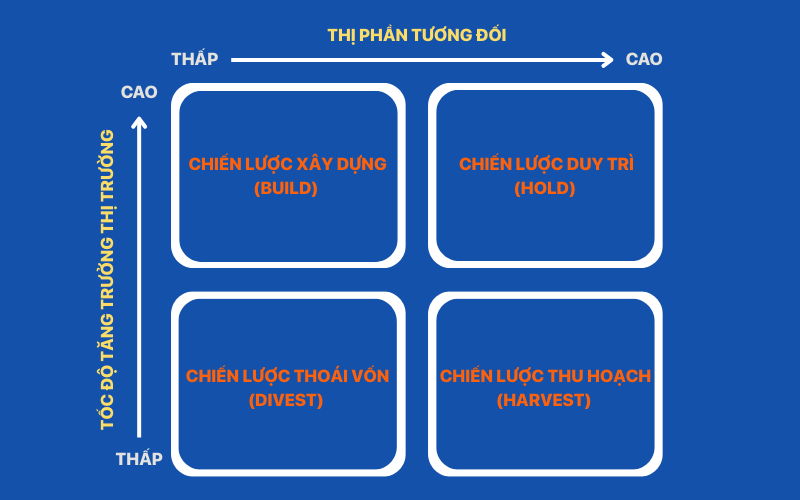 Dữ liệu từ việc phân tích ma trận BCG cung cấp nền tảng quan trọng để các đơn vị kinh doanh chiến lược (SBU) xác định hướng phát triển phù hợp với vị thế thị trường và nguồn lực hiện có. Tương ứng với bốn phân khúc trong ma trận BCG, doanh nghiệp có thể áp dụng bốn nhóm chiến lược kinh doanh cơ bản gồm: chiến lược xây dựng (Build), chiến lược duy trì (Hold), chiến lược thu hoạch (Harvest) và chiến lược thoái vốn (Divest).