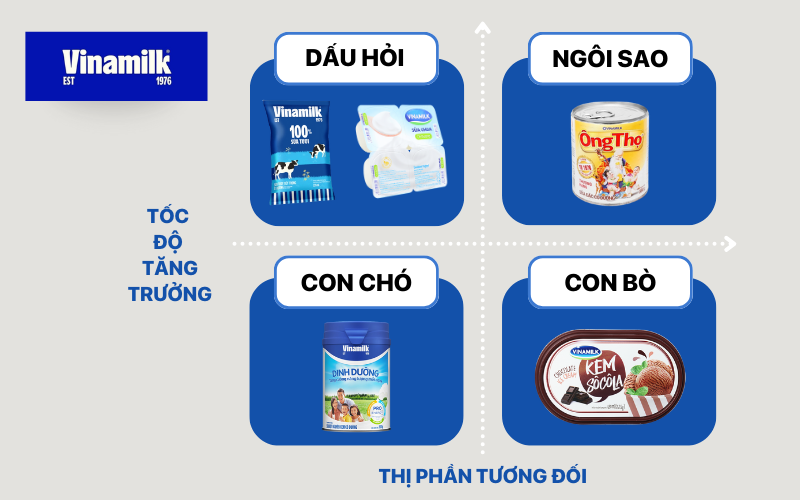 Để hiểu rõ cách áp dụng ma trận BCG trong thực tế, có thể xem xét danh mục sản phẩm của Vinamilk - một trong những doanh nghiệp sữa lớn nhất Việt Nam với danh mục sản phẩm đa dạng, phục vụ nhiều phân khúc thị trường khác nhau. Dựa trên thị phần và tốc độ tăng trưởng của ngành sữa Việt Nam, danh mục sản phẩm chủ lực của Vinamilk có thể được phân tích theo ma trận BCG như sau:
