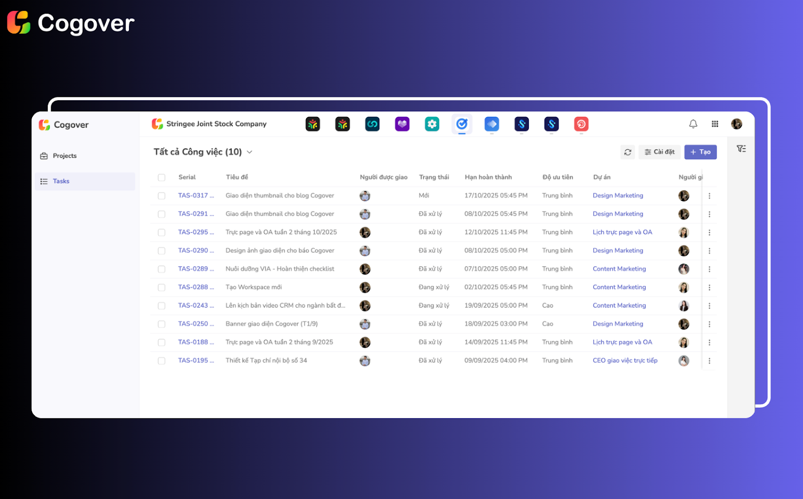 Để áp dụng ma trận Eisenhower hiệu quả hơn trong thực tế, bạn có thể sử dụng hệ thống quản lý công việc giúp phân loại ưu tiên, theo dõi tiến độ và tự động nhắc hạn. Cogover Task hỗ trợ đầy đủ các thao tác này với giao diện đơn giản và trực quan.
