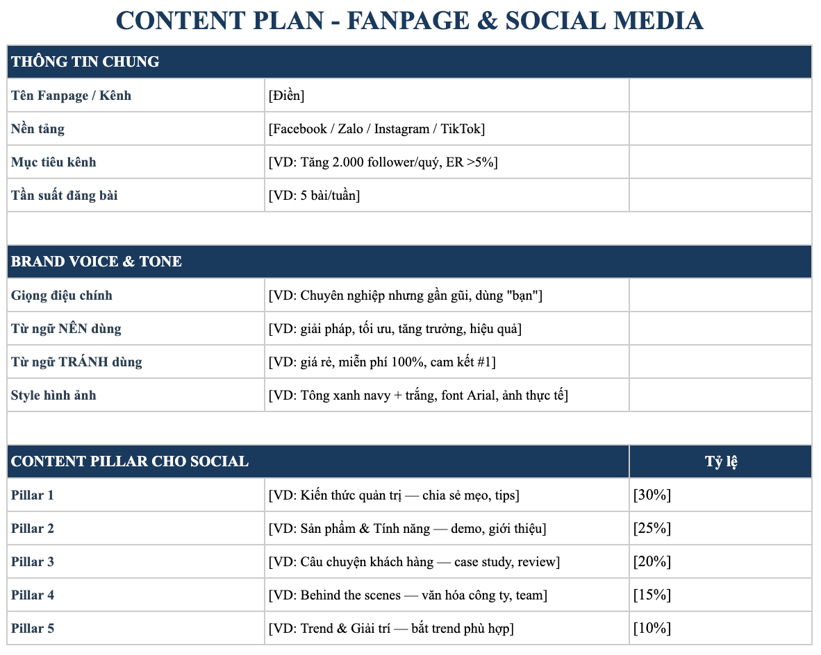 Mẫu bao gồm: Creative Brief (giọng điệu, style hình ảnh, do/don't), Content Pillar và tỷ lệ phân bổ bài viết theo pillar, Calendar đăng bài tuần/tháng với cột caption, hashtag, hình ảnh, kênh đăng (Facebook, Zalo OA, Instagram, TikTok), Bảng theo dõi hiệu quả từng bài (reach, engagement, click). Đây là mẫu content plan cho fanpage được nhiều SME yêu cầu nhất vì mạng xã hội vẫn là kênh marketing chủ lực của hầu hết doanh nghiệp Việt Nam.