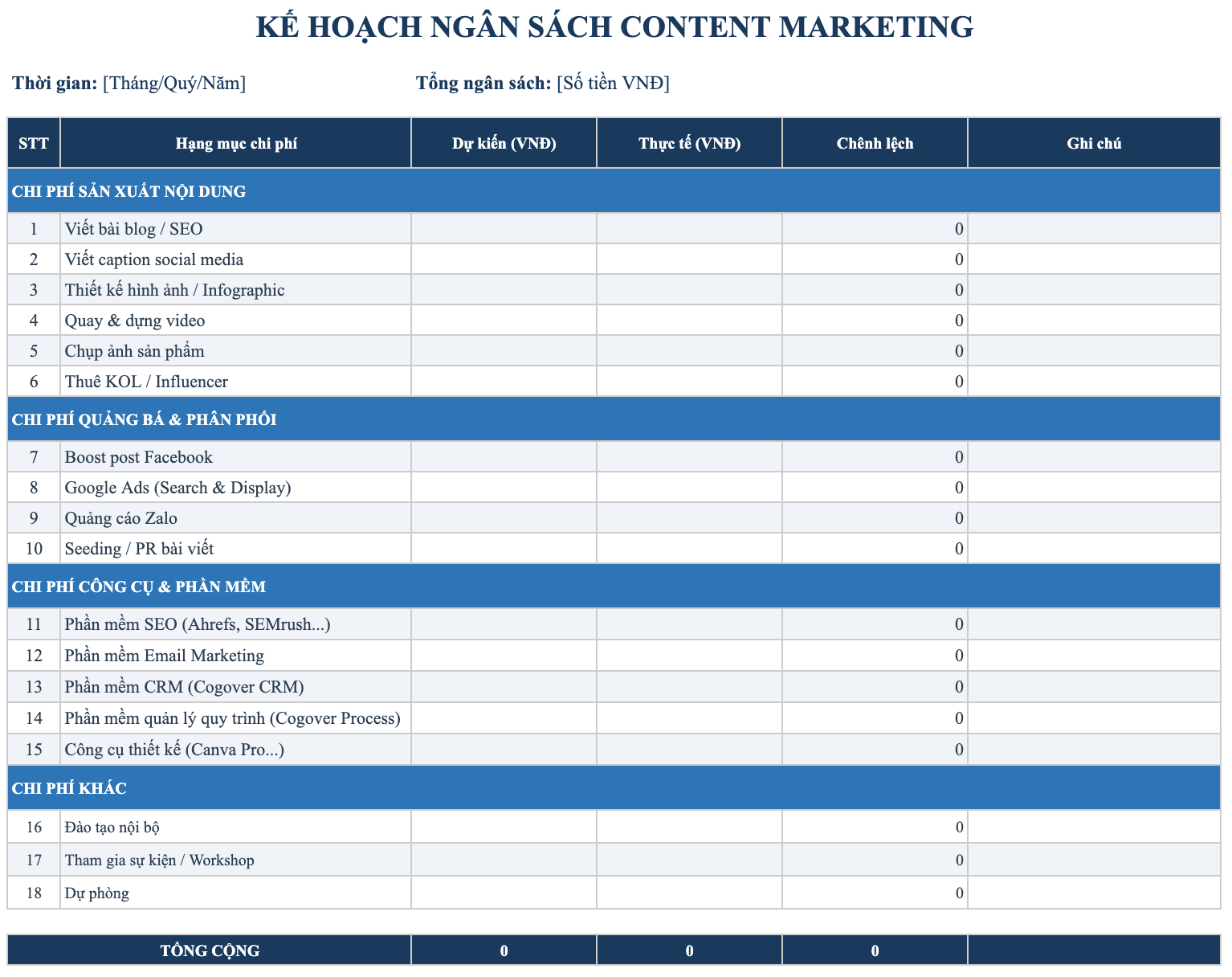 Mẫu gồm các hạng mục: chi phí sản xuất nội dung (thuê writer, designer, quay video), chi phí quảng bá (boost post, Google Ads, KOL), chi phí công cụ (phần mềm SEO, email marketing, CRM), và chi phí khác. Mỗi hạng mục có cột dự kiến, thực tế và chênh lệch để đối chiếu cuối tháng. Đây là mẫu mà ít bài viết đối thủ đề cập nhưng lại cực kỳ cần thiết cho SME vì ngân sách thường rất eo hẹp.