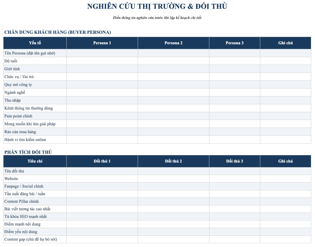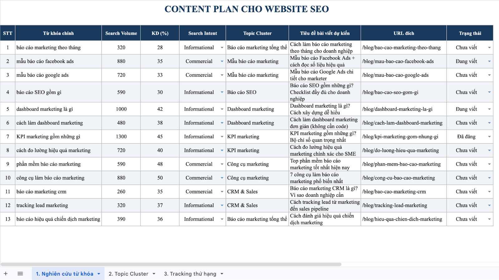 Mẫu bao gồm: Danh sách từ khóa mục tiêu (kèm cột search volume, keyword difficulty, search intent), Topic Cluster mapping, Outline bài viết mẫu, Lịch trình sản xuất và xuất bản, Tracking thứ hạng từ khóa theo thời gian. Mẫu này đặc biệt hữu ích cho doanh nghiệp đang đầu tư vào SEO dài hạn để thu hút khách hàng từ Google.