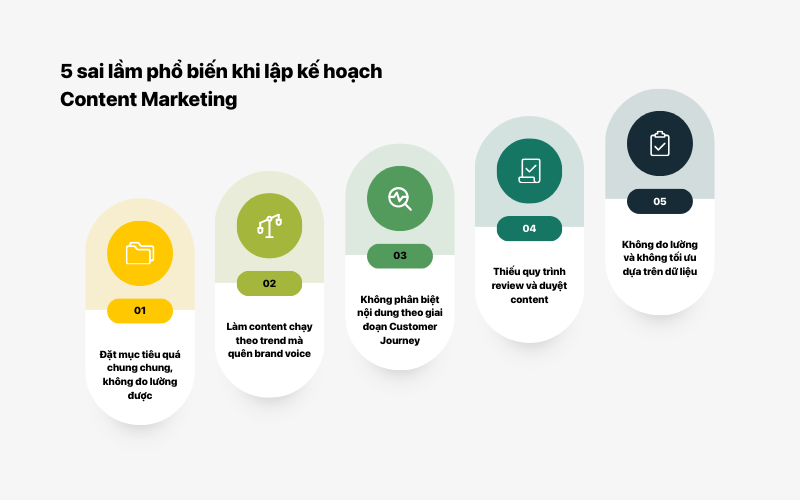 Cách khắc phục: Dành ít nhất 30 phút mỗi tuần để review số liệu. Thiết lập dashboard đơn giản trên Google Analytics hoặc Google Data Studio. Mỗi tháng, tổng kết: 3 bài có hiệu quả nhất là bài nào, tại sao? 3 bài kém nhất là bài nào, thiếu gì? Từ đó điều chỉnh kế hoạch tháng tiếp theo. Nhớ rằng, content marketing là trò chơi dài hơi, nhưng mỗi tháng phải tốt hơn tháng trước dựa trên những gì dữ liệu cho thấy.