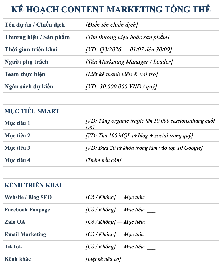 Mẫu này gồm các sheet chính: Tổng quan dự án (mục tiêu, ngân sách, timeline), Nghiên cứu (đối thủ, buyer persona, SWOT), Định hướng nội dung (content pillar, brand voice, key message), Kế hoạch triển khai theo tháng, và Bảng đo lường KPI. Đây là file xương sống mà mọi hoạt động content đều xoay quanh.