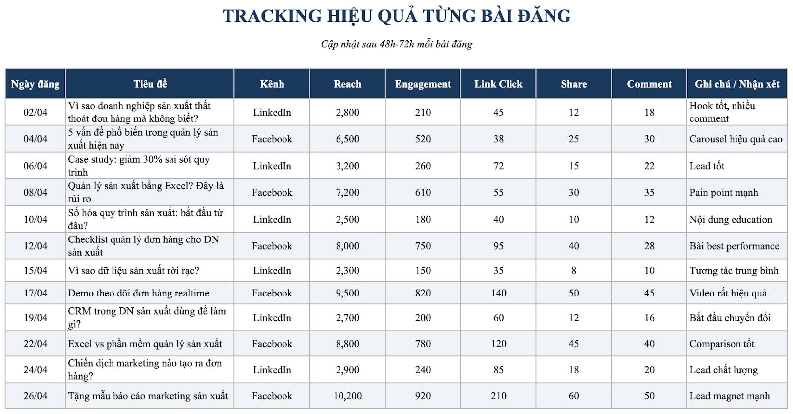 Ví dụ trên cho thấy cách một doanh nghiệp B2B nhỏ có thể phân bổ nội dung đều đặn qua tuần, bao phủ cả 3 giai đoạn Customer Journey và xen kẽ giữa các kênh. Bạn hoàn toàn có thể điều chỉnh tần suất và kênh phù hợp với nguồn lực thực tế của doanh nghiệp mình.