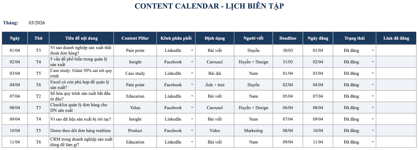 Mẫu calendar này ở dạng lịch trực quan, giúp team nhìn nhanh trong tuần hoặc tháng sẽ đăng bài gì, trên kênh nào, ai phụ trách. Các cột bao gồm: ngày, tiêu đề, pillar, kênh, định dạng, người viết, người duyệt, deadline, trạng thái, link bài đã đăng. Mẫu calendar rất phù hợp để in ra dán lên bảng hoặc dùng chung trên Google Sheets.