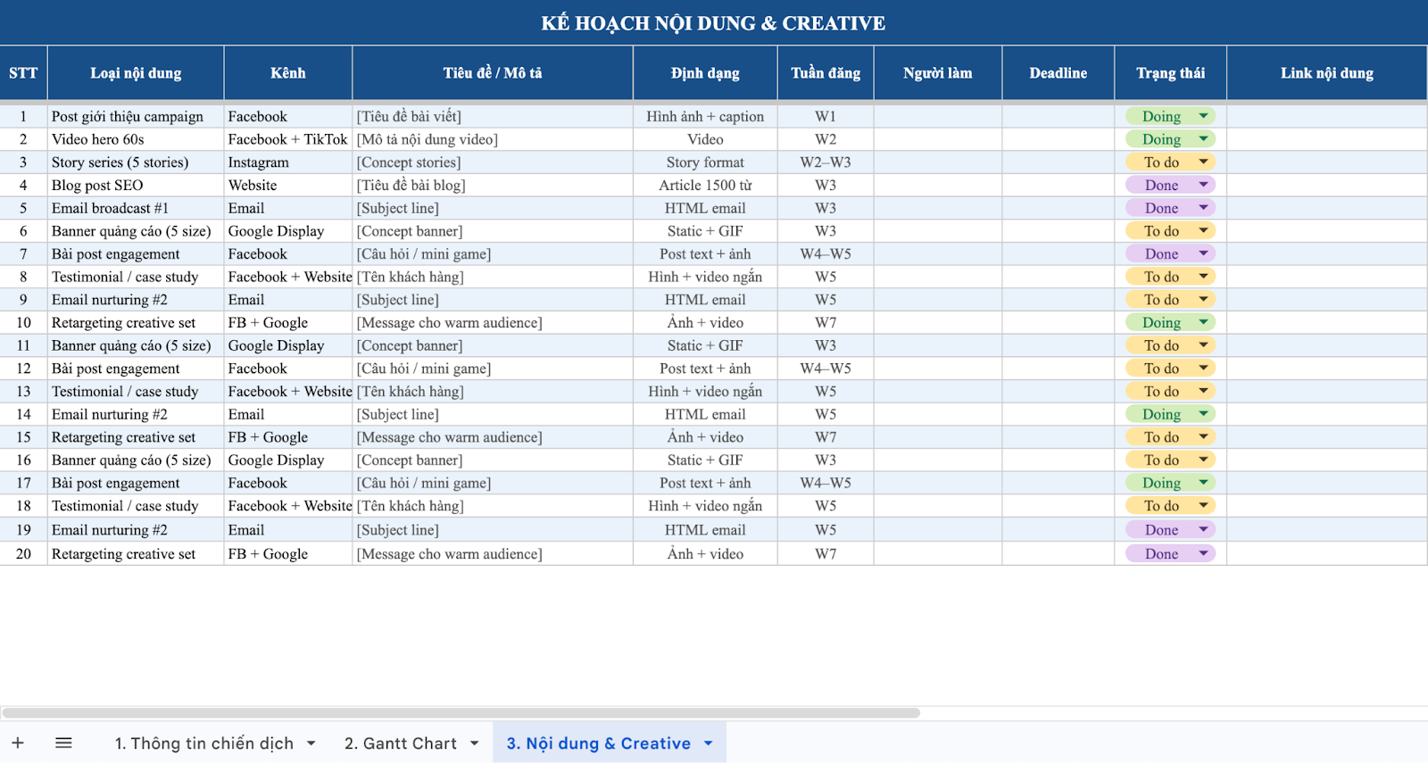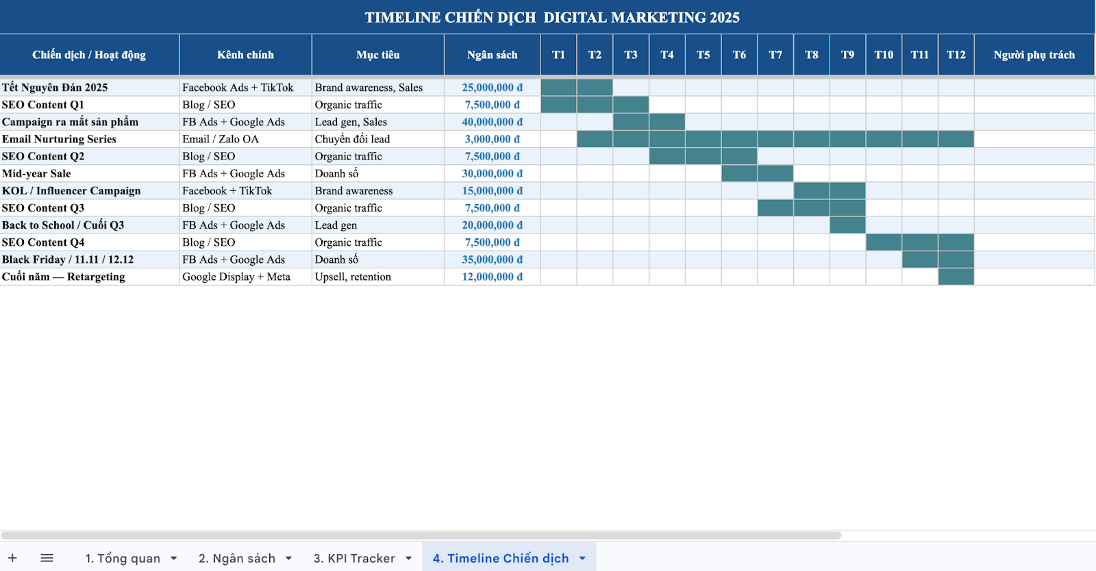 Mẫu kế hoạch này thường được xây dựng trên Excel hoặc Google Sheets và có thể tích hợp biểu đồ Gantt để dễ theo dõi tiến độ. Đây là công cụ phù hợp cho các team marketing khi cần phối hợp nhiều bộ phận để triển khai một chiến dịch lớn.