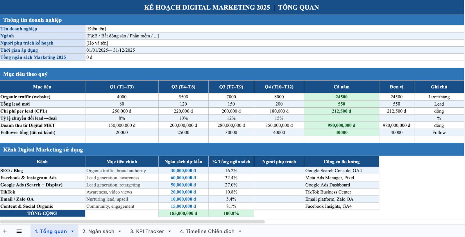 Mẫu kế hoạch digital marketing tổng thể theo năm thường được sử dụng khi doanh nghiệp lập kế hoạch đầu năm và cần định hướng chiến lược cho 12 tháng tiếp theo. Kế hoạch này bao gồm mục tiêu marketing theo từng quý, tổng ngân sách dự kiến và cách phân bổ ngân sách theo từng kênh. Bên cạnh đó, mẫu kế hoạch cũng cần xác định bộ KPI cho cả năm và xây dựng timeline cho các chiến dịch lớn.